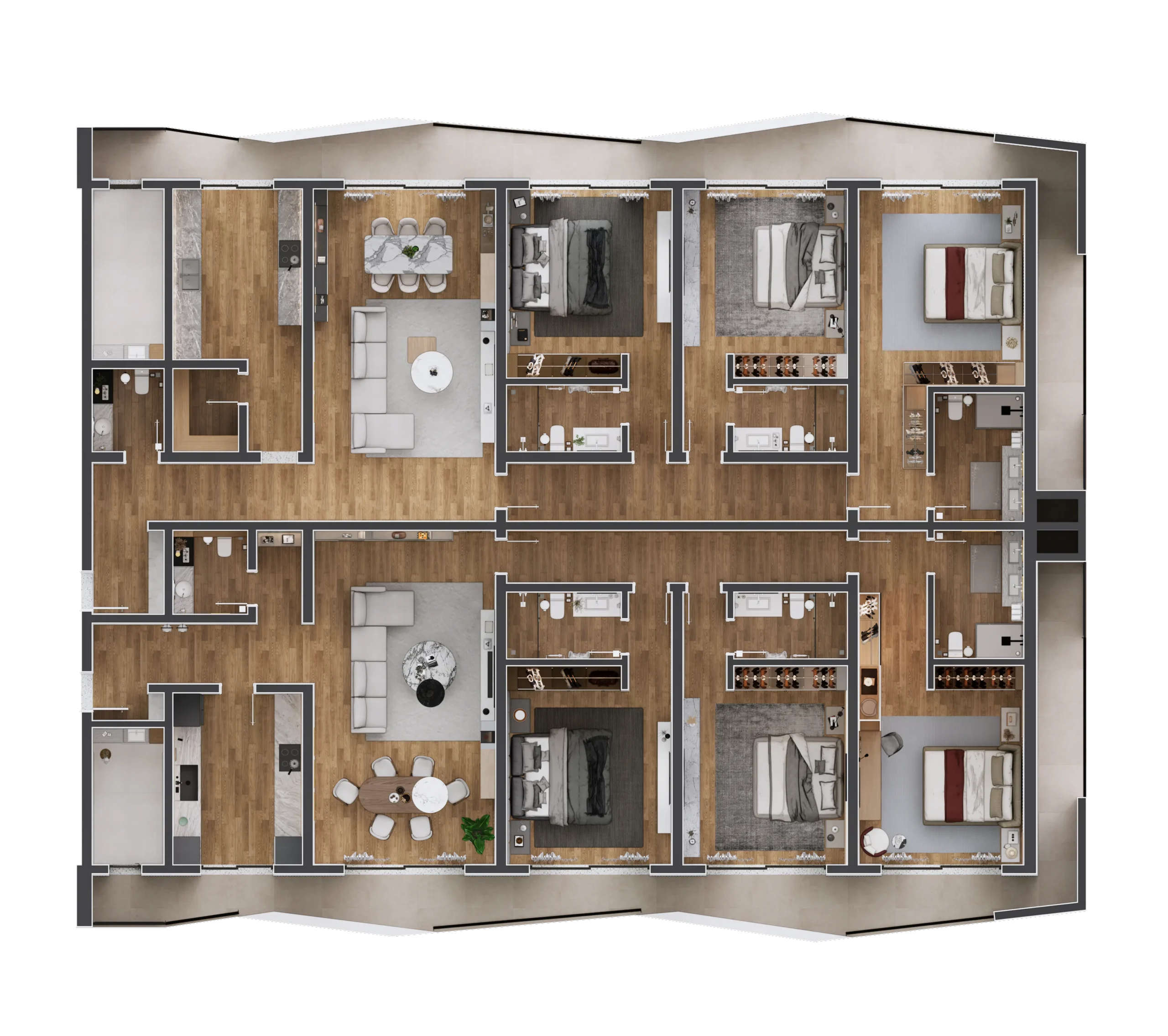 O apartamento T3 distingue-se pela generosidade das áreas e pela versatilidade da sua distribuição, respondendo às necessidades de agregados familiares de diferentes dimensões. A tipologia privilegia a funcionalidade, a privacidade das zonas de descanso e a integração harmoniosa das áreas sociais, criando um ambiente contemporâneo, confortável e adaptado aos novos estilos de vida urbanos.